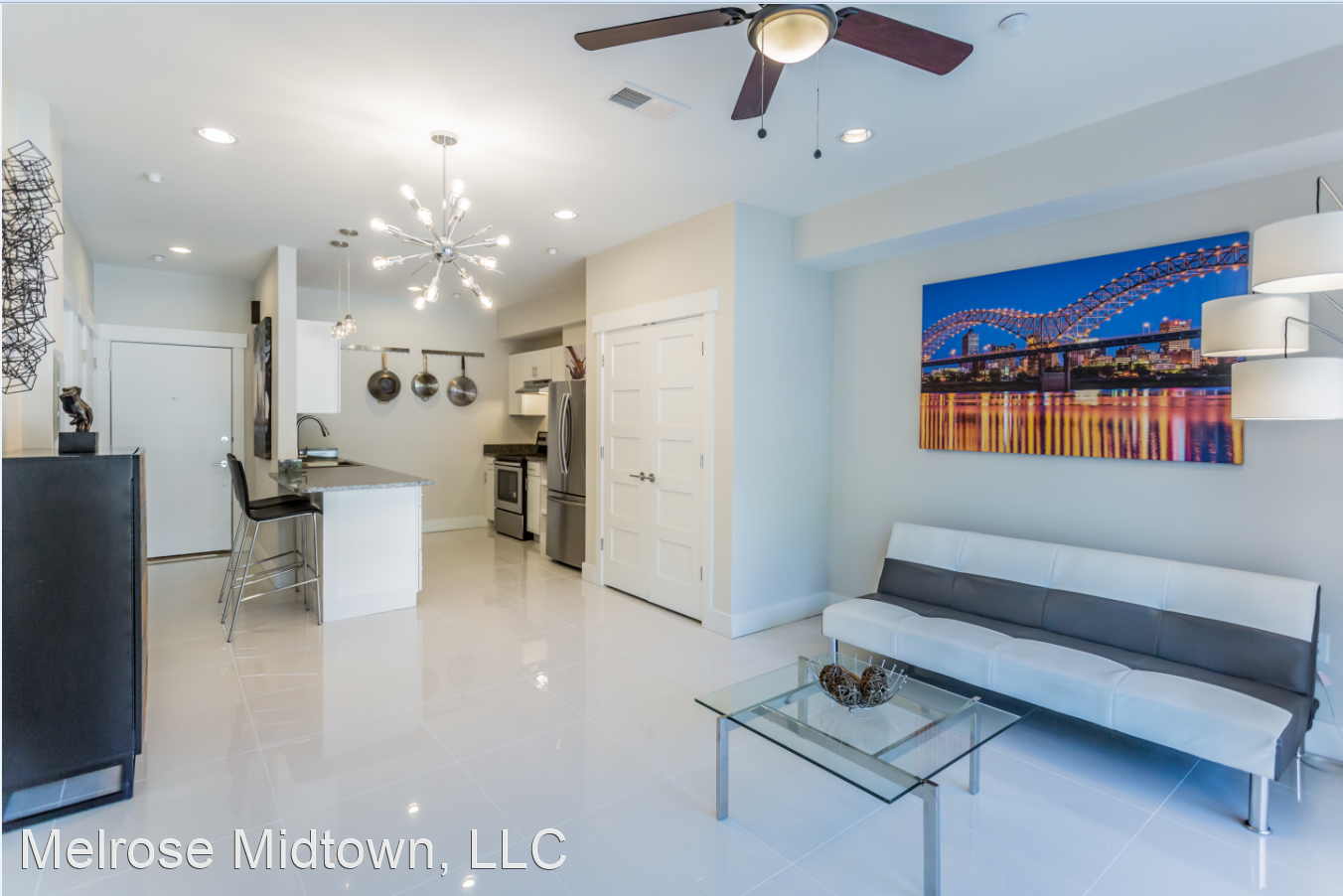 The Kay - The Kay is one of our most beautiful apartments. The Kay's open-plan great room features a granite island for entertaining or casual dining, stainless appliances, pendent lighting, walk-in closet, and marble bathroom. The second bedroom is great for roommates, a home office, a guest room, or gaming command center. You'll find endless cabinets and a full-height pantry in the chef's kitchen, along with all-new granite countertops. A full bath opens off the great room. As a corner unit, the Kay offers two balconies. There is so much light and air that you might not even need your built-in ceiling fans. But you'll have them, just in case. The Melrose was named Best Apartment Community in Memphis by the readers of the Commercial Appeal newspaper three years in a row. Are you ready to move? We're ready to meet you! Prices may be higher on higher floors (including the penthouse).